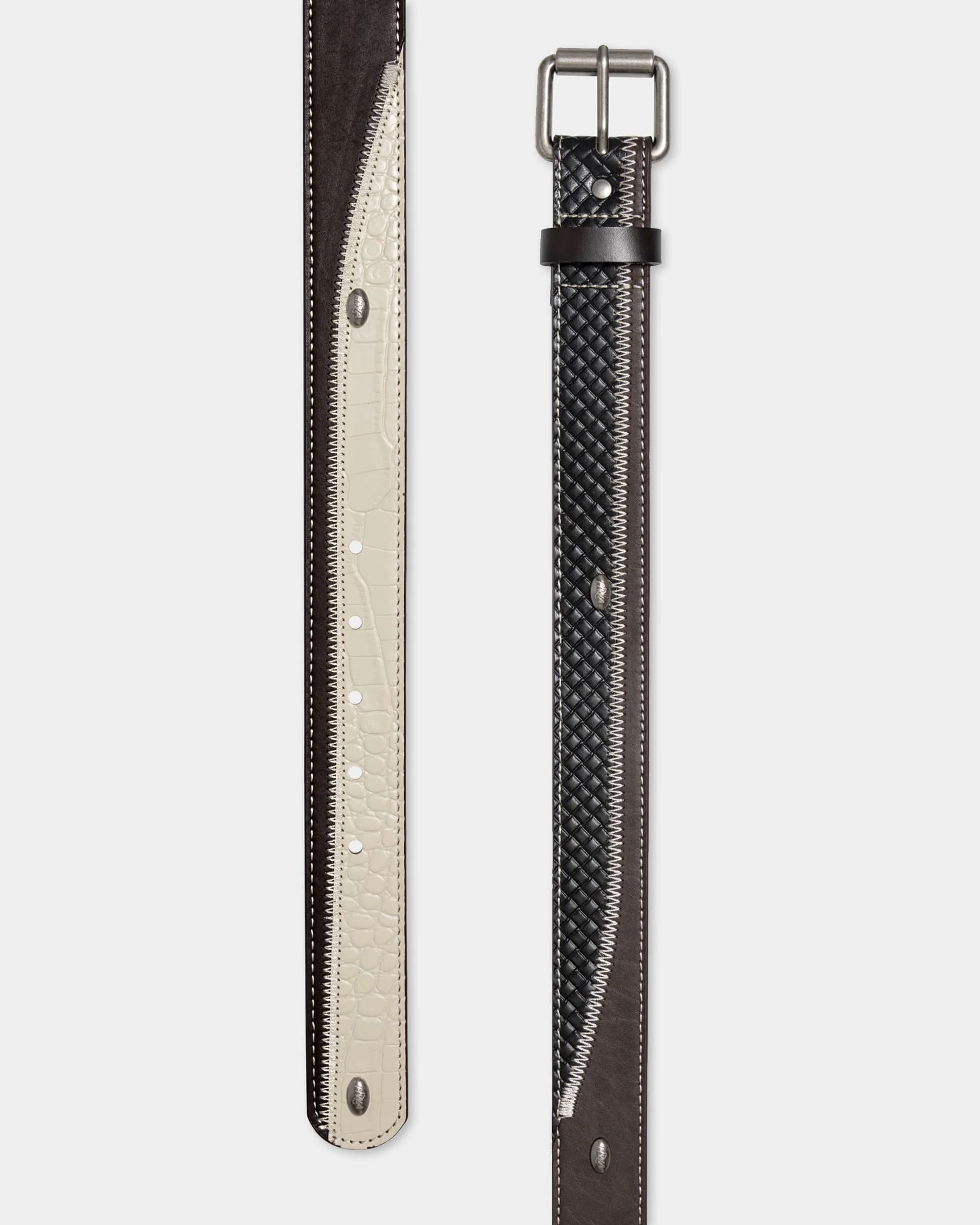 - Ceinture cloutée en patchwork de cuir multi-textures.